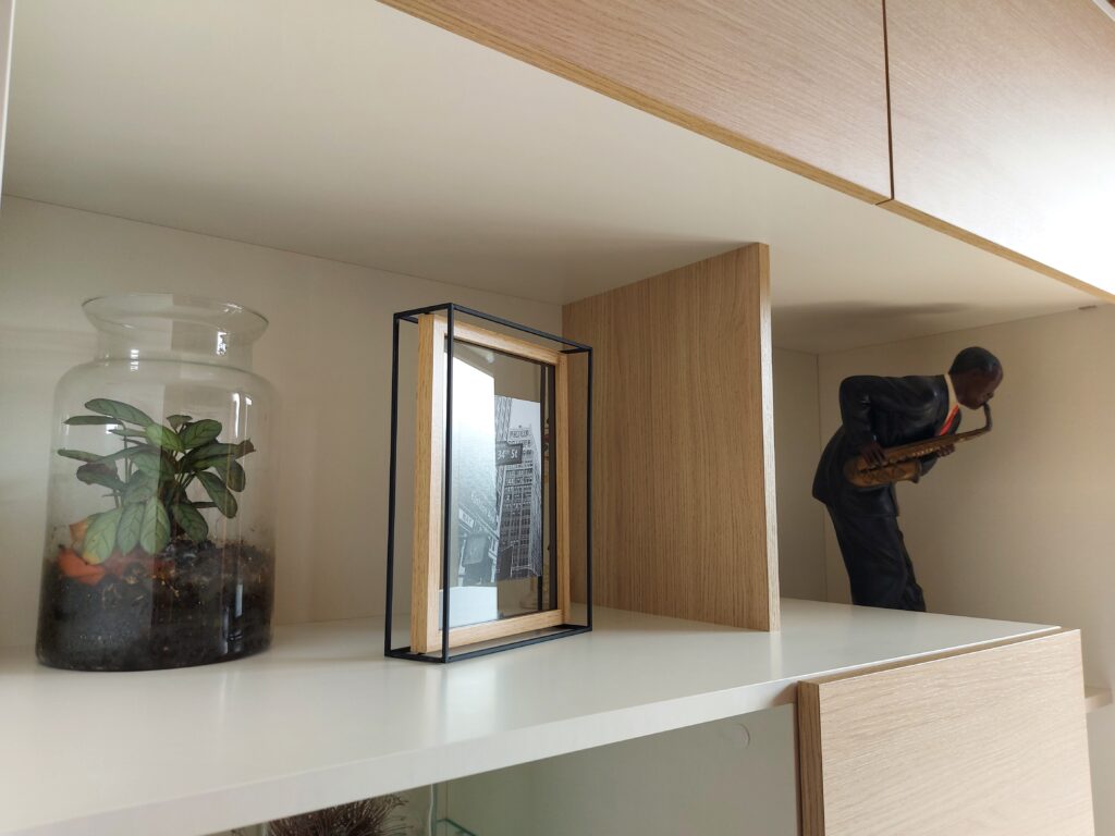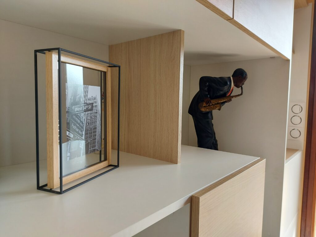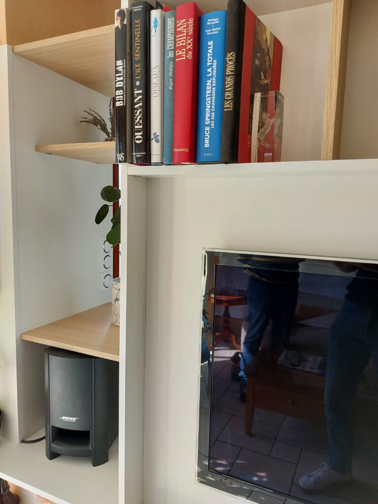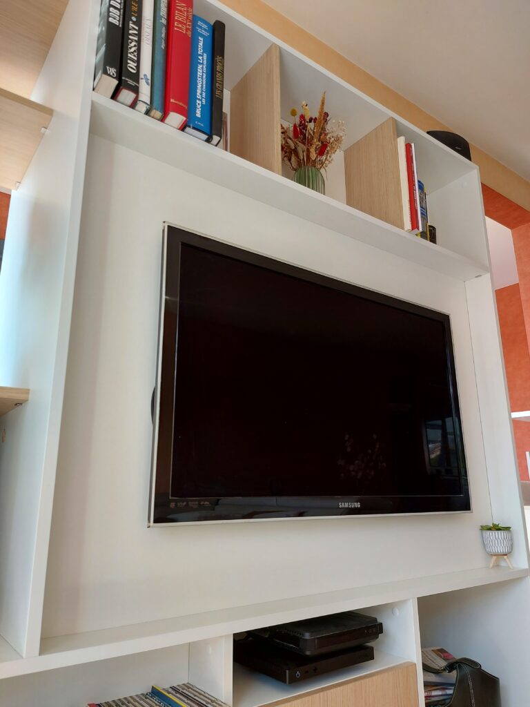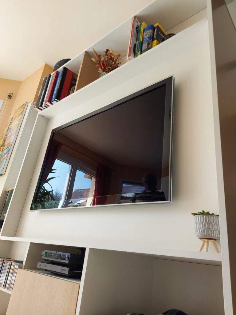 Du côté séjour, le meuble RECTO VERSO se transforme en une unité de divertissement. Il accueille la télévision et autres équipements multimédia, tout en offrant des espaces de rangement supplémentaires pour les livres, les DVD et autres objets. Les étagères et les compartiments ont été conçus pour maximiser l’espace disponible et créer un environnement de détente et de confort visuel.
