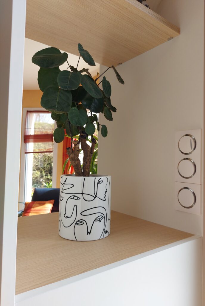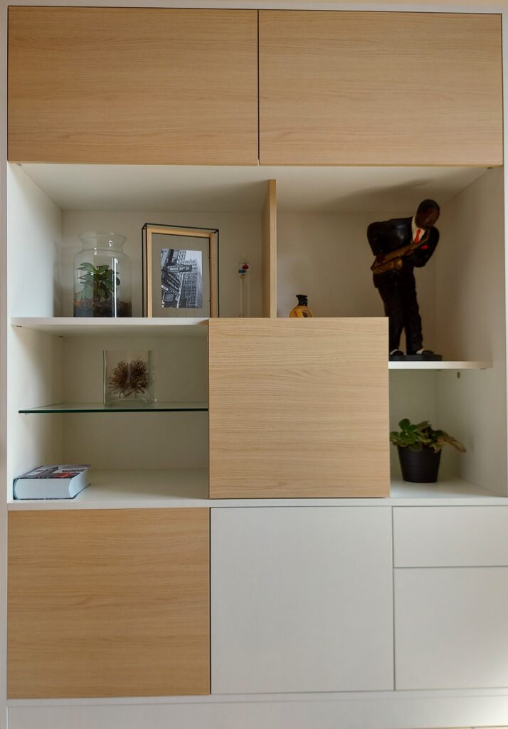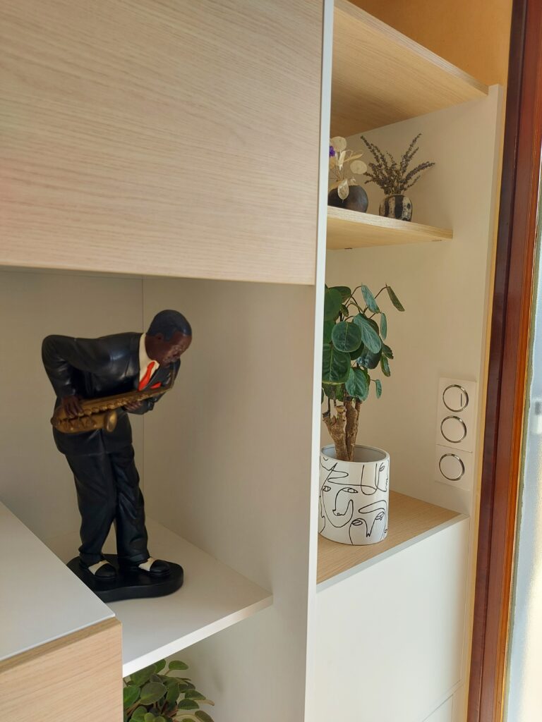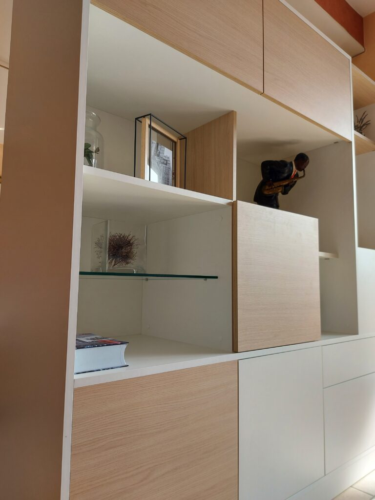 Nous avons récemment conçu et installé un meuble d’entrée-séjour, baptisé RECTO VERSO, qui allie fonctionnalité et esthétique pour répondre aux besoins spécifiques de nos clients. Ceux-ci désiraient non seulement séparer leur espace de vie, mais aussi optimiser le rangement de manière élégante et pratique.