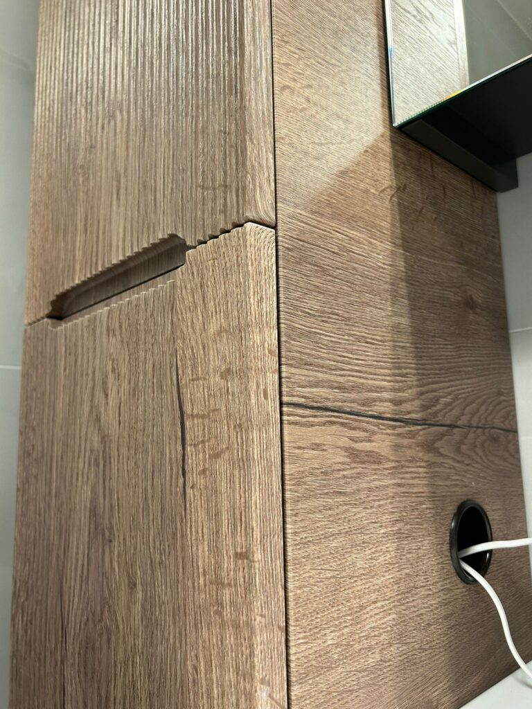 Nous avons également installé un meuble double vasque en bois plissé, qui ajoute une touche de chaleur naturelle. Les vasques en céramique, contrastent avec le bois et offrent une durabilité et une très bonne facilité d’entretien.